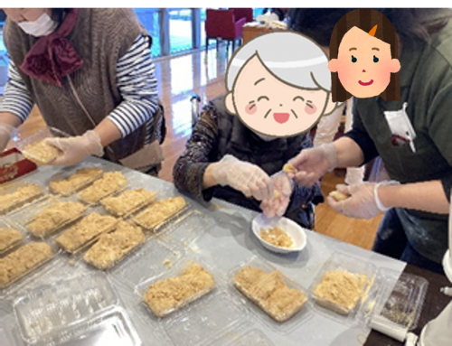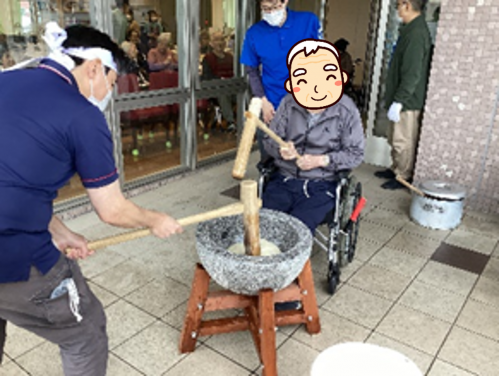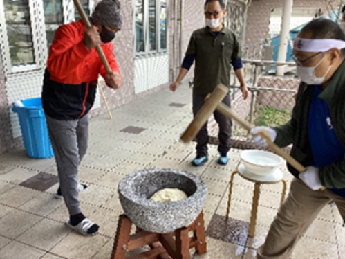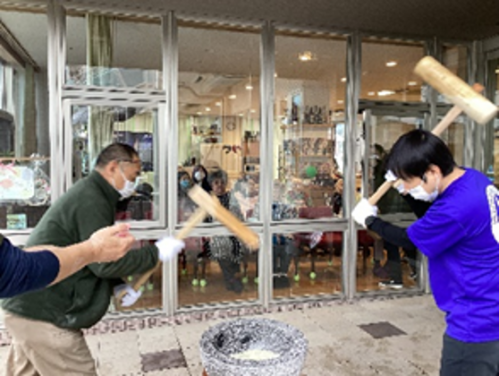 はじめのうちは職員の餅つきを、みなさま真剣にみられていました。